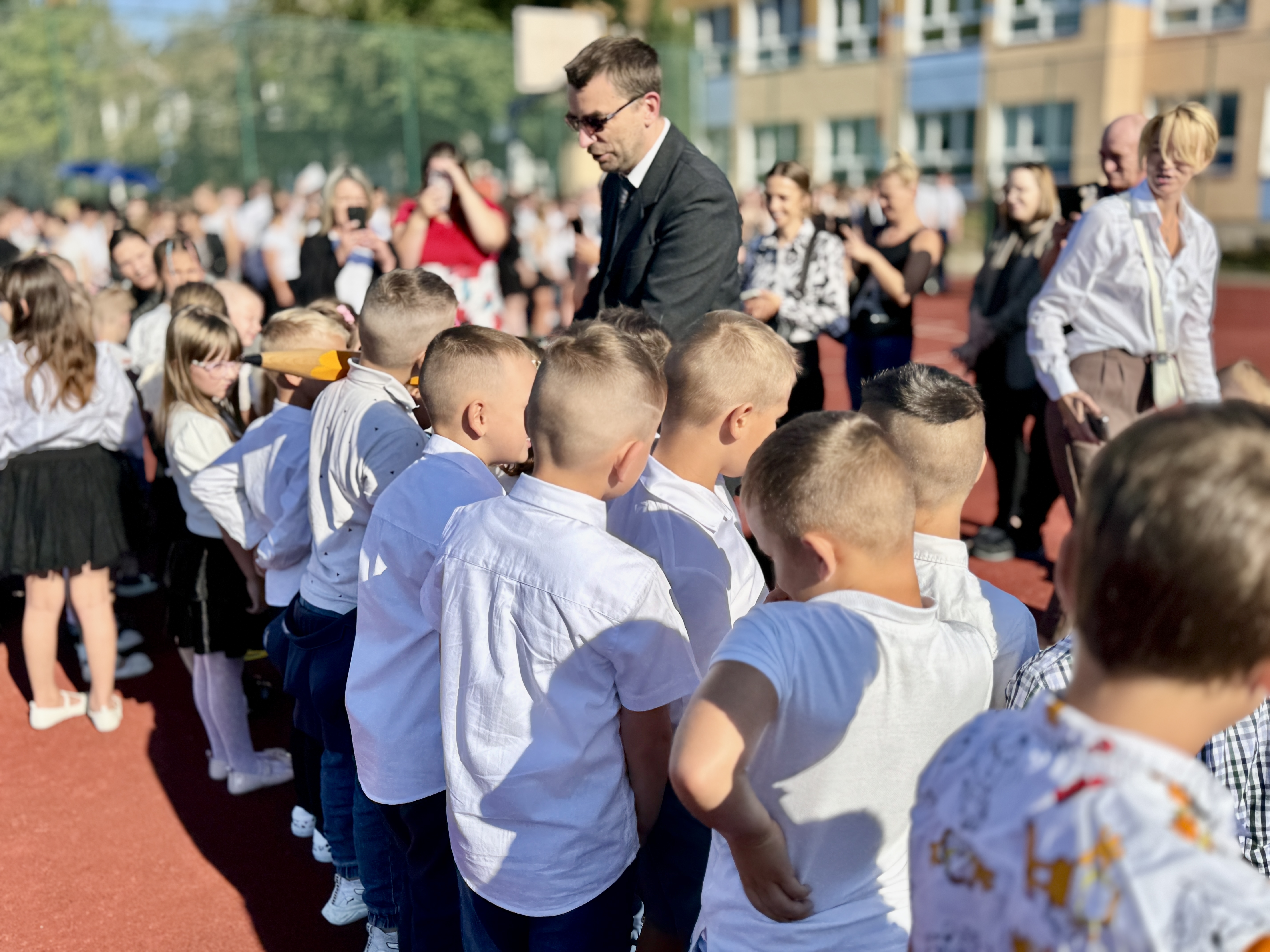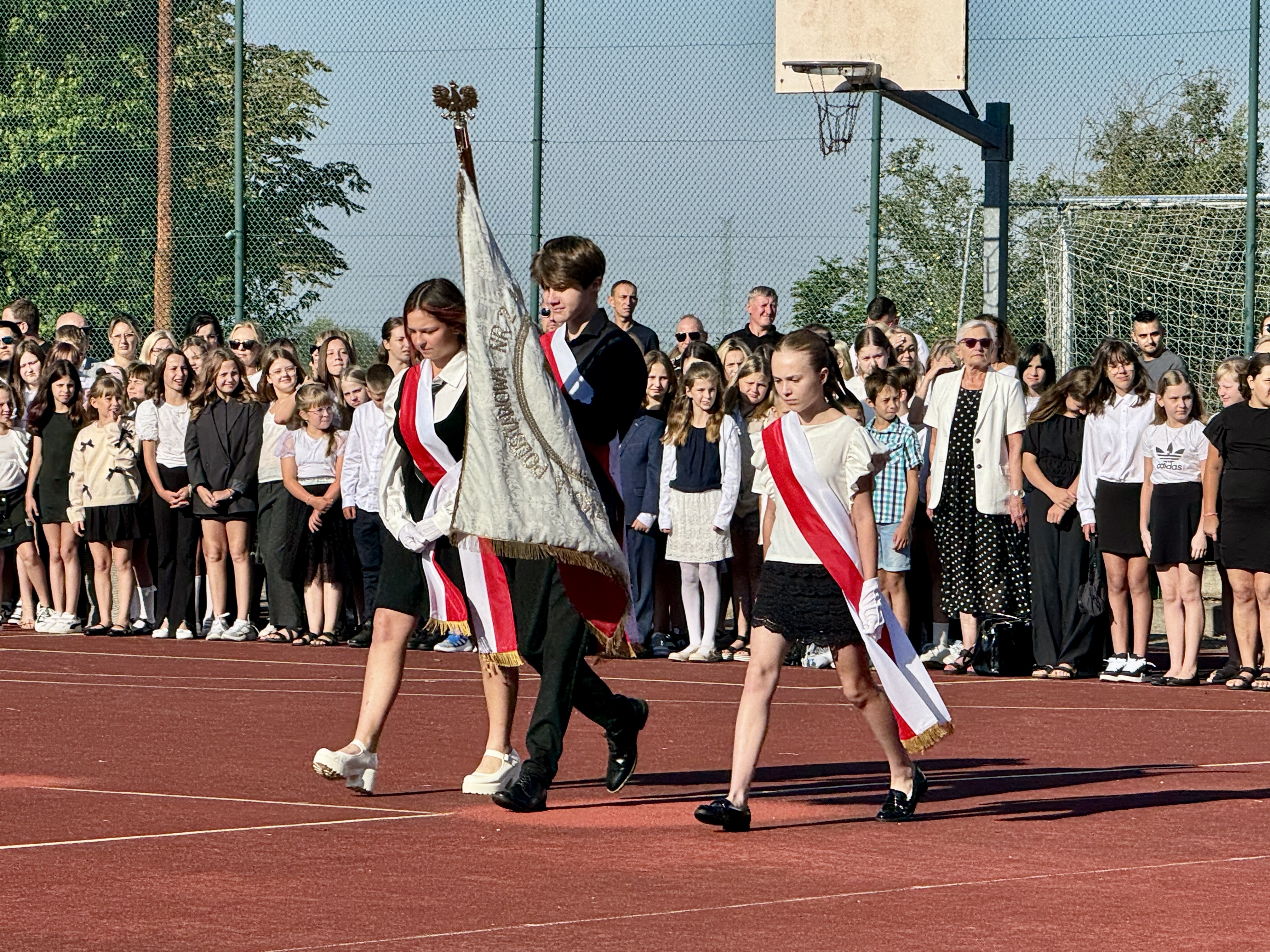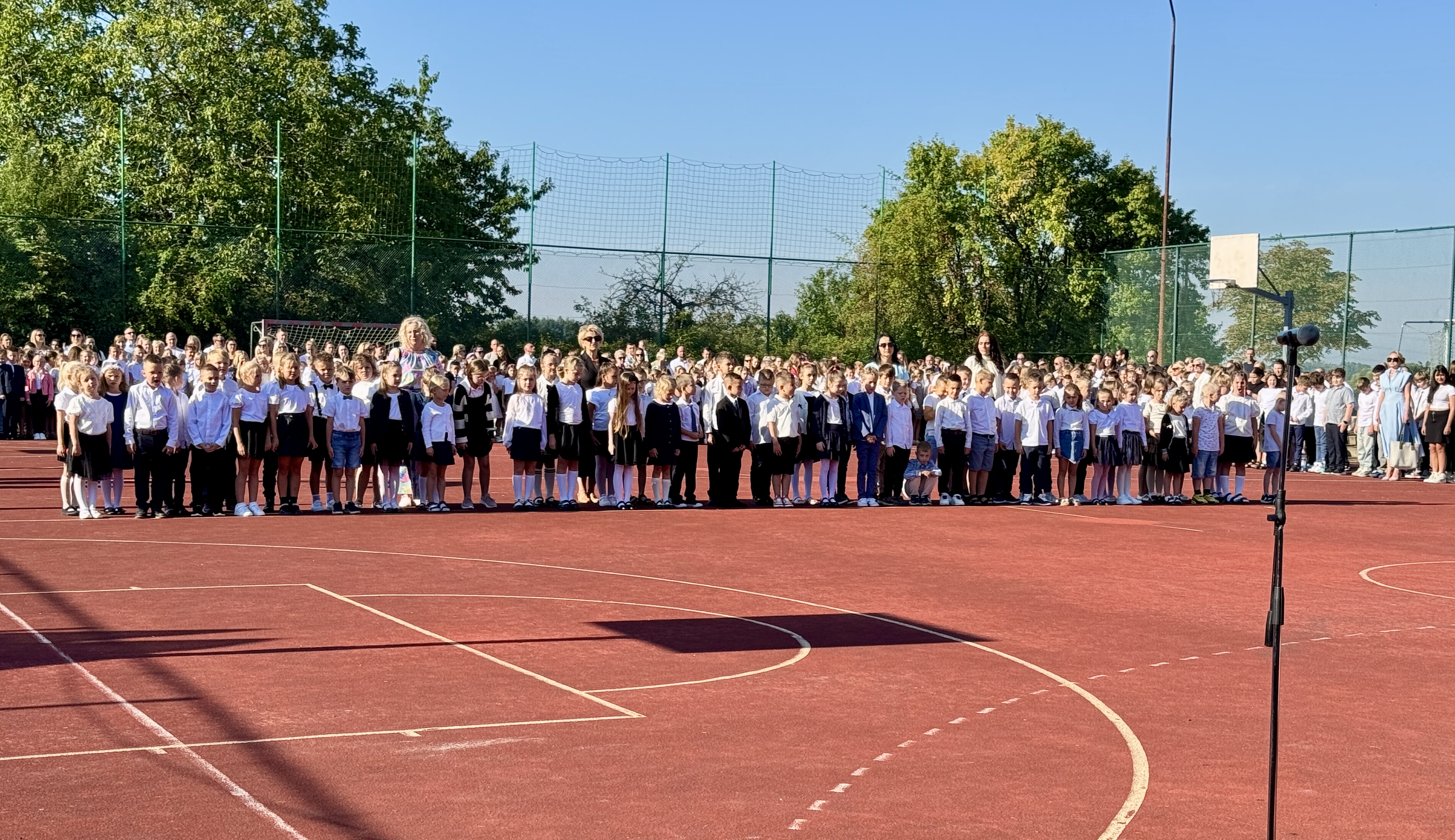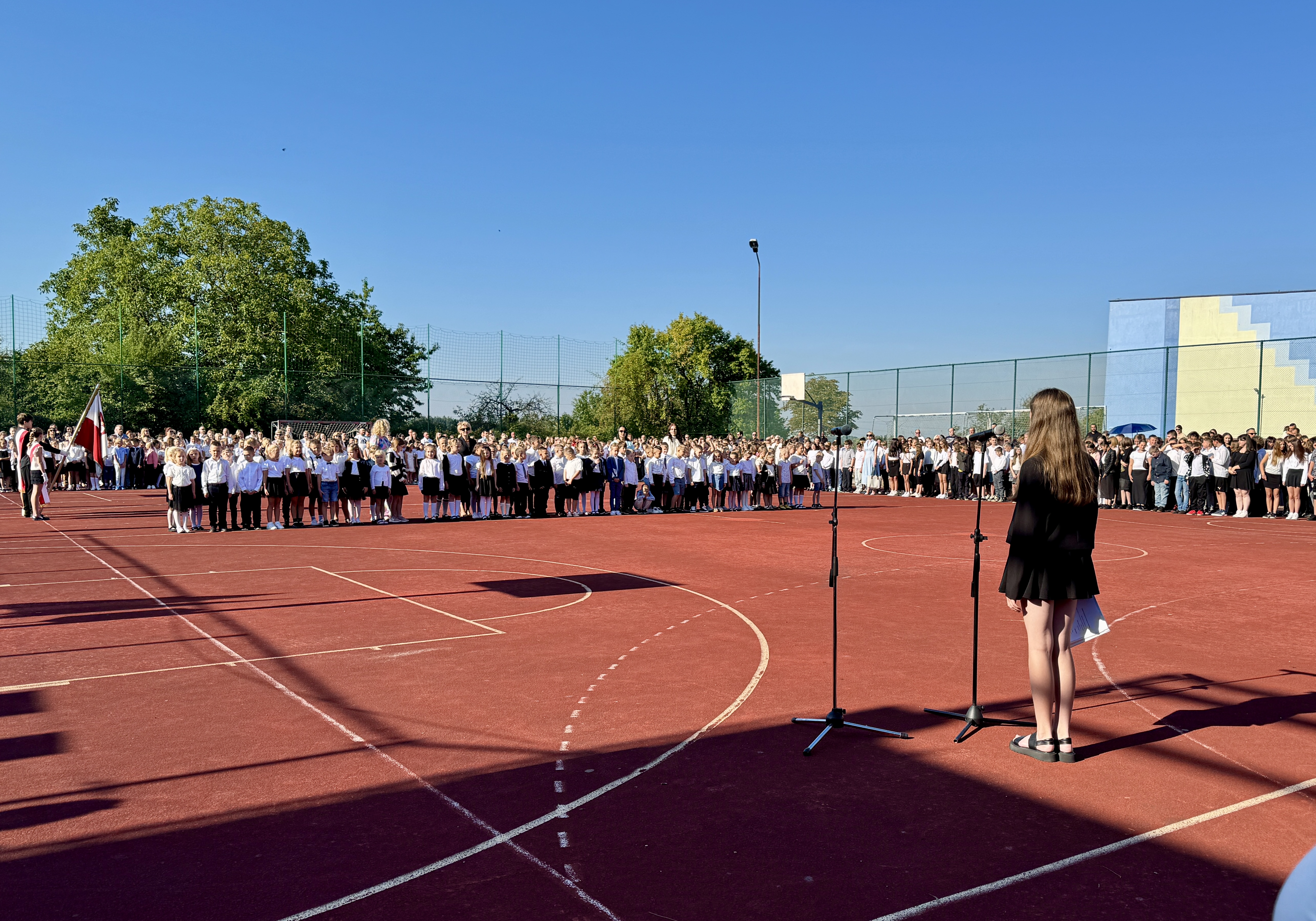 Uczniowie, Rodzice i Pracownicy SP2 zgromadzili się na boisku przed szkołą, by uroczyście rozpocząć nowy rok szkolny 2025/2026.