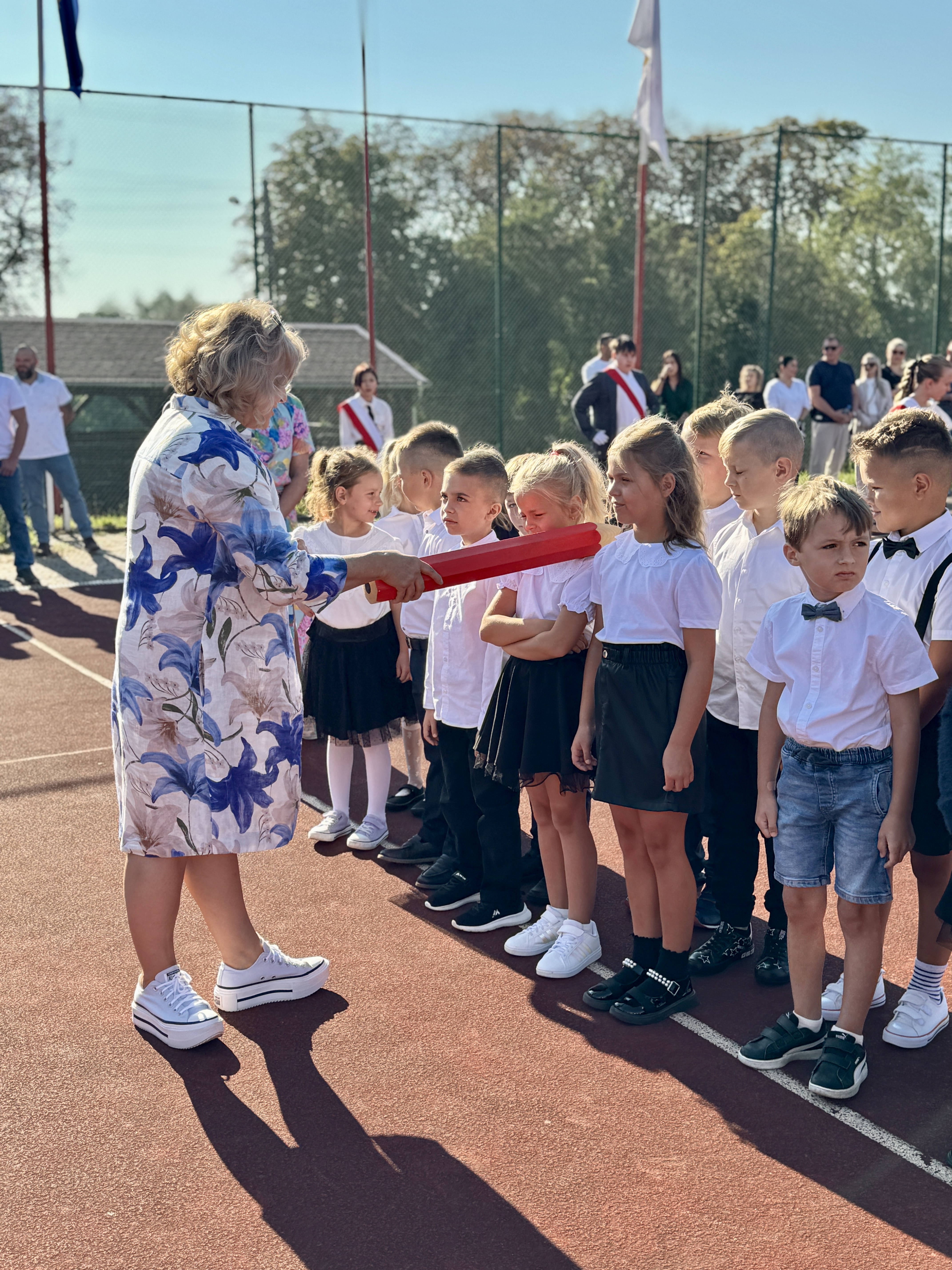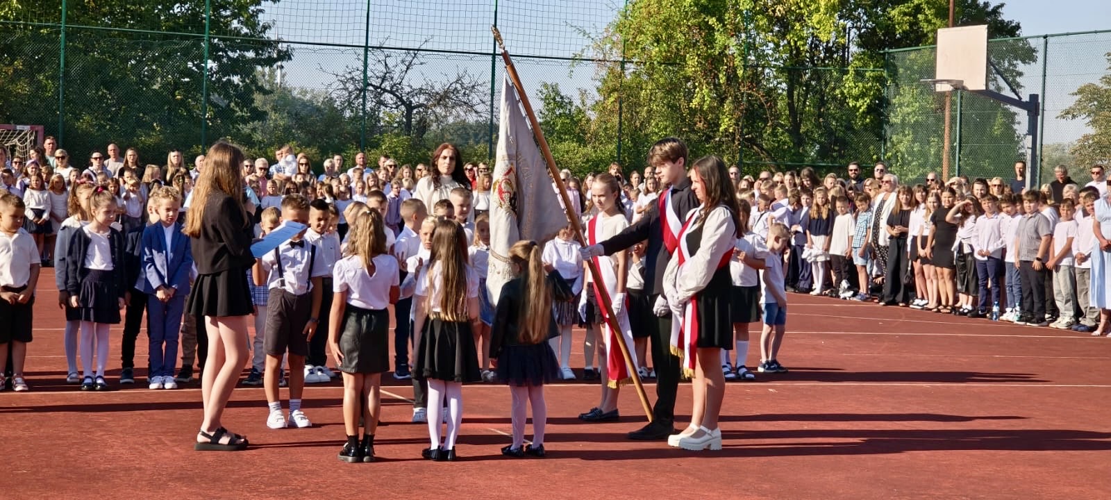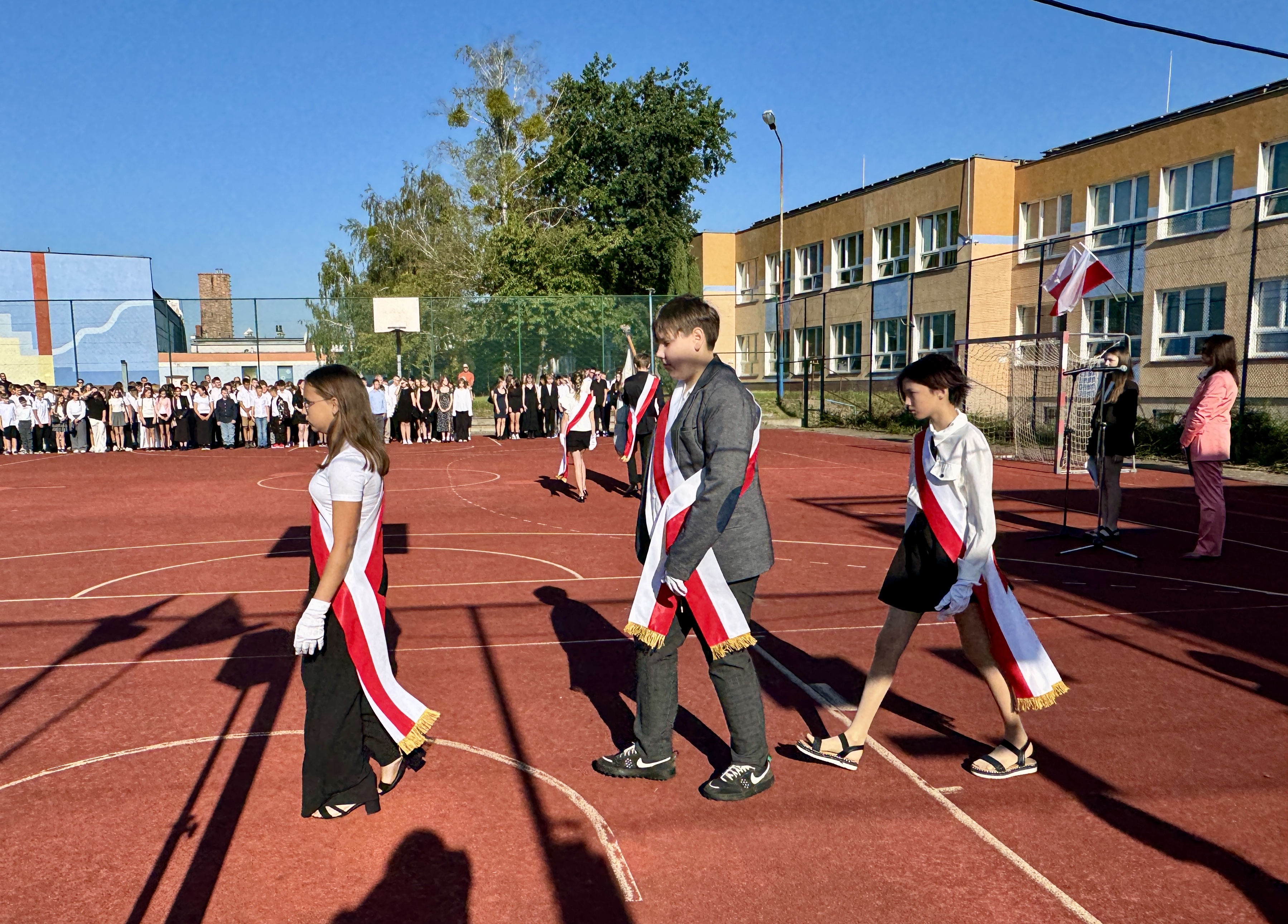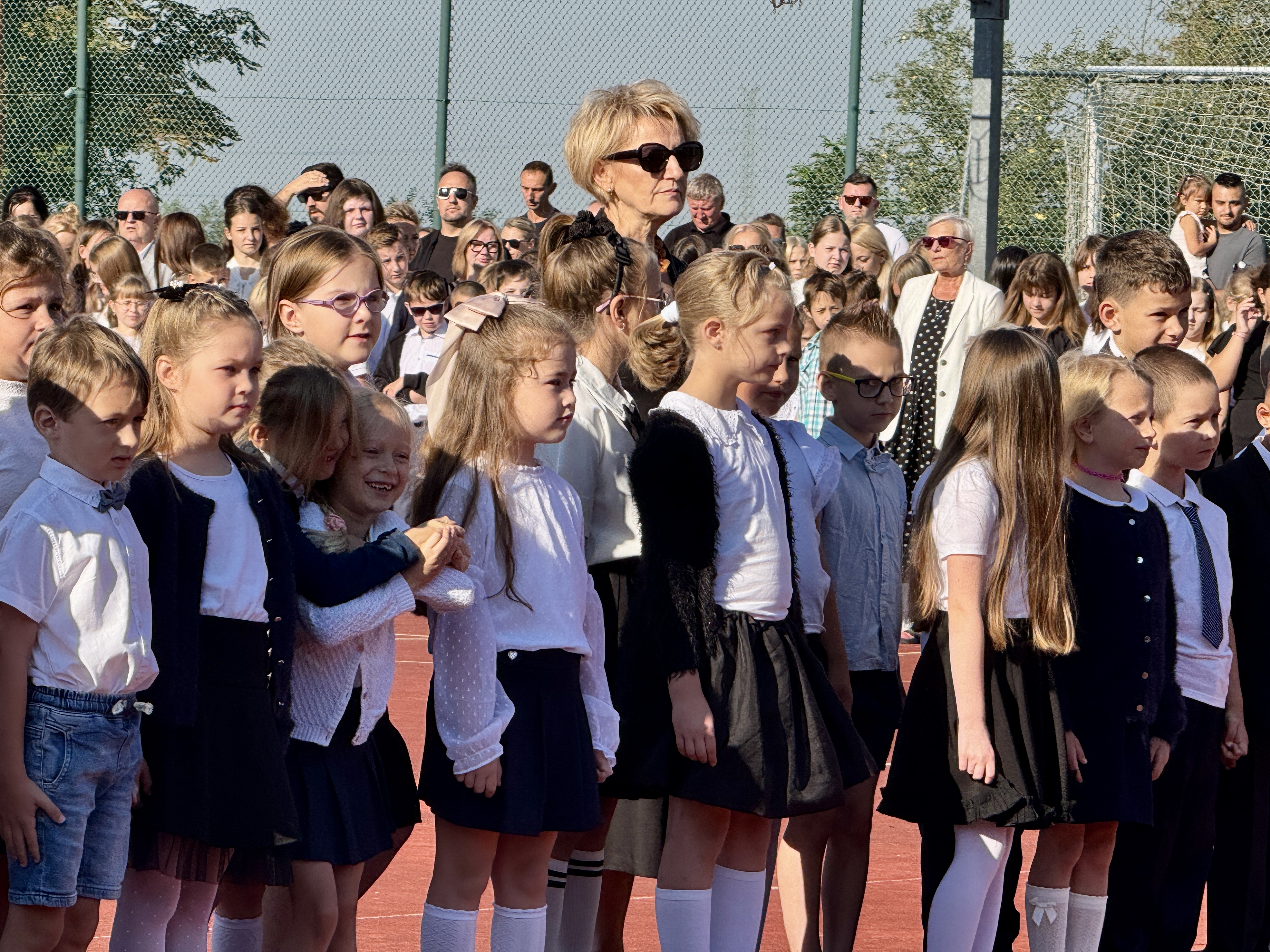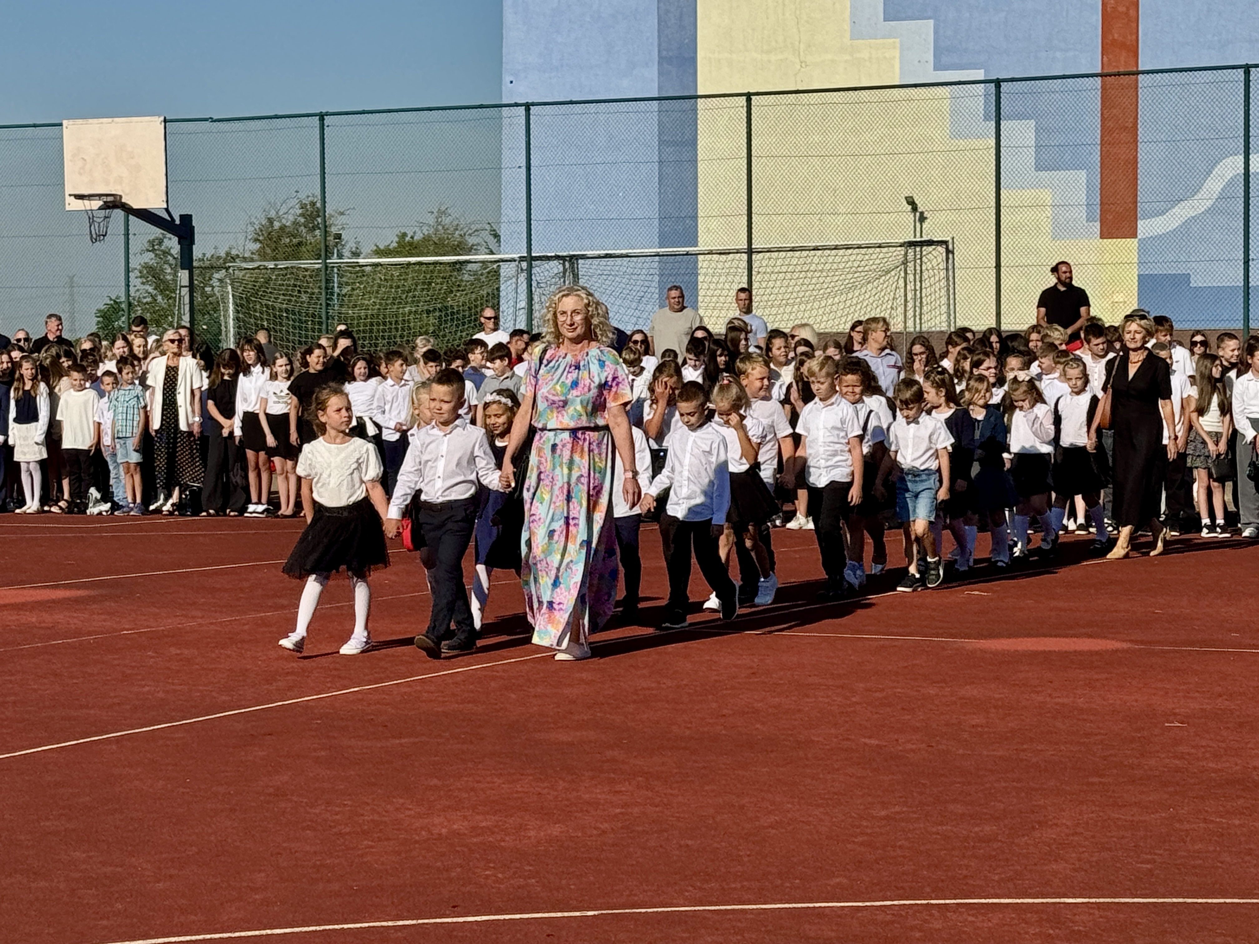 Uczniowie, Rodzice i Pracownicy SP2 zgromadzili się na boisku przed szkołą, by uroczyście rozpocząć nowy rok szkolny 2025/2026.