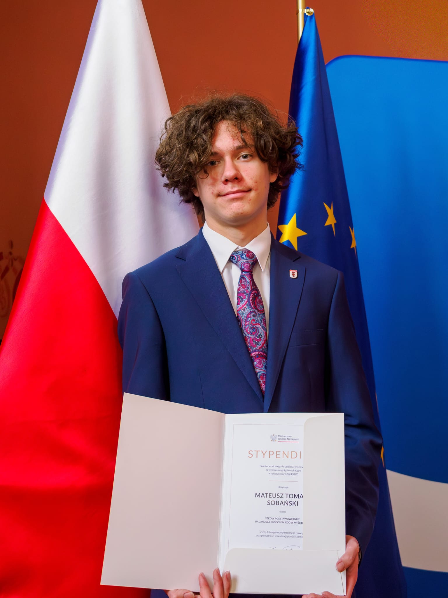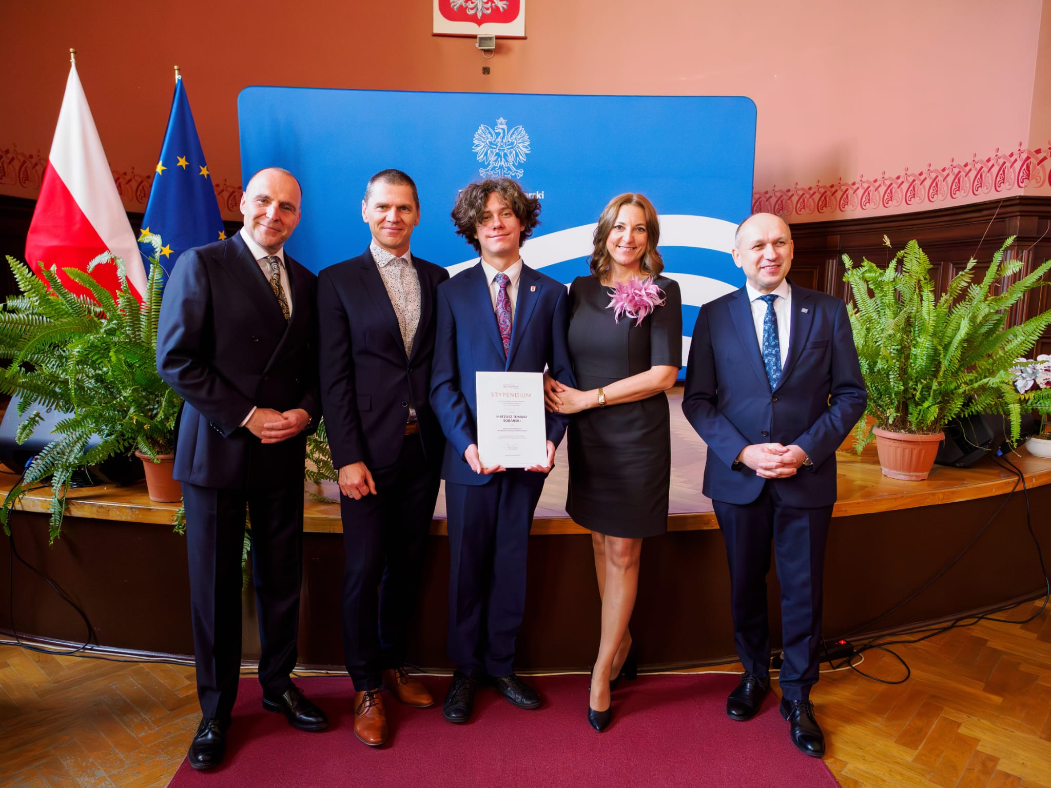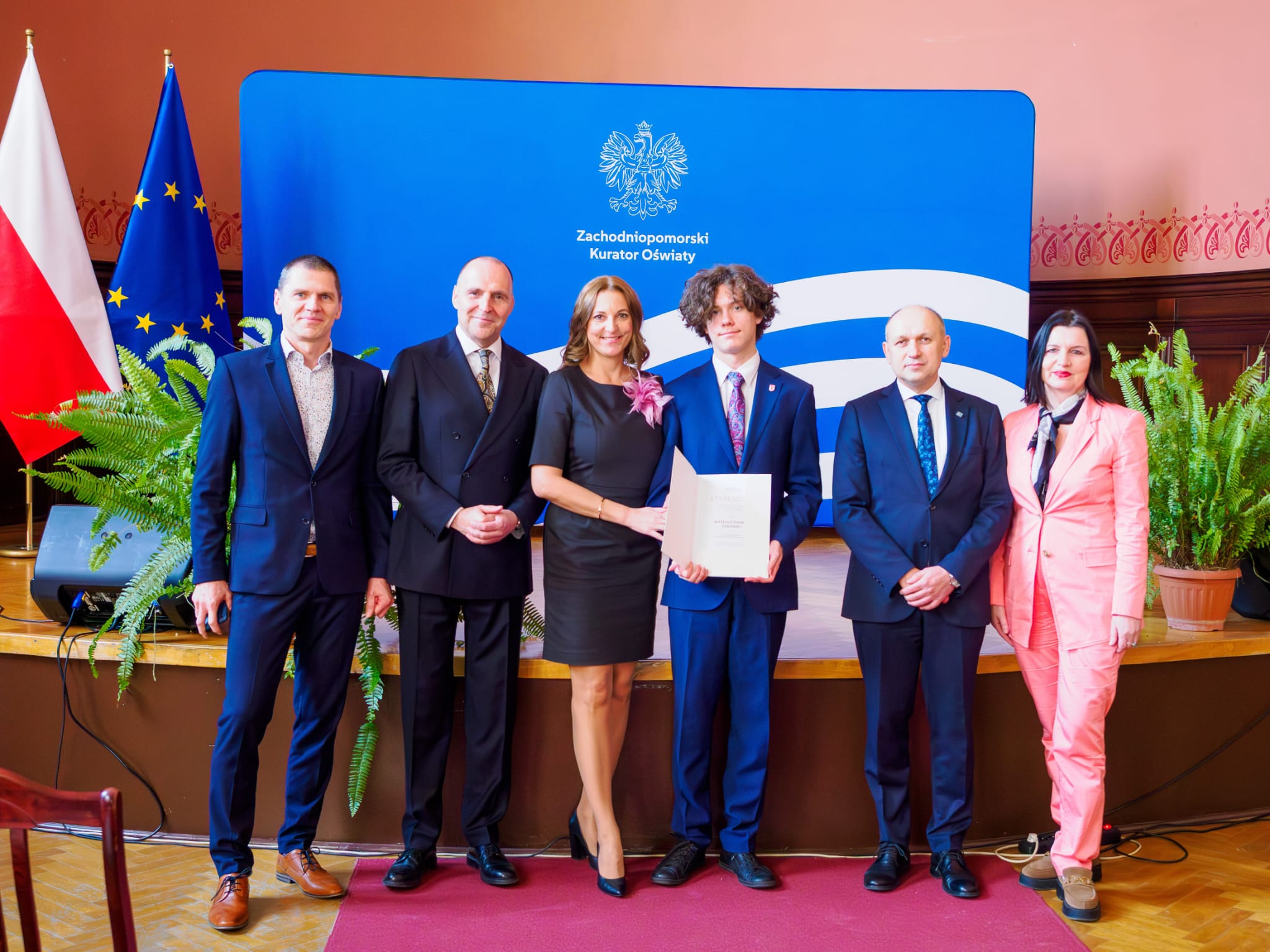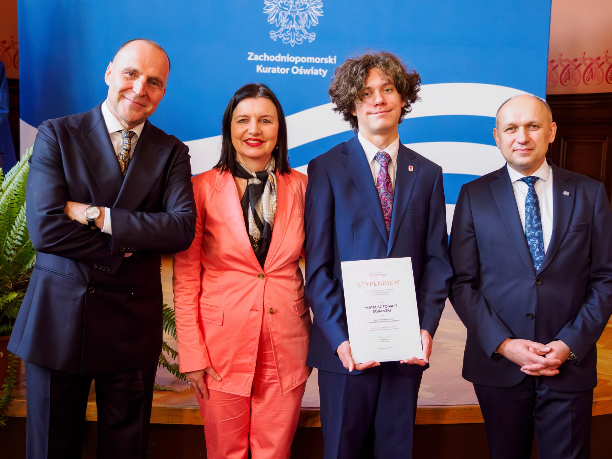 Bardzo się cieszymy z wielkiego sukcesu naszego ucznia. Stypendium otrzymało jedynie 35 uczniów z województwa zachodnipomorskiego. Nasz Mateusz był pierwszym stypendystą na liście. Na uroczystości wręczania stypendium był obecny Pan Adam Rudawski- wojewoda zachodniopomorski. Mateuszowi w tej wyjątkowej chwili towarzyszyli dumni rodzice- Anna i Tomasz Sobańscy oraz dyrektor szkoły Anna Zabłotna.