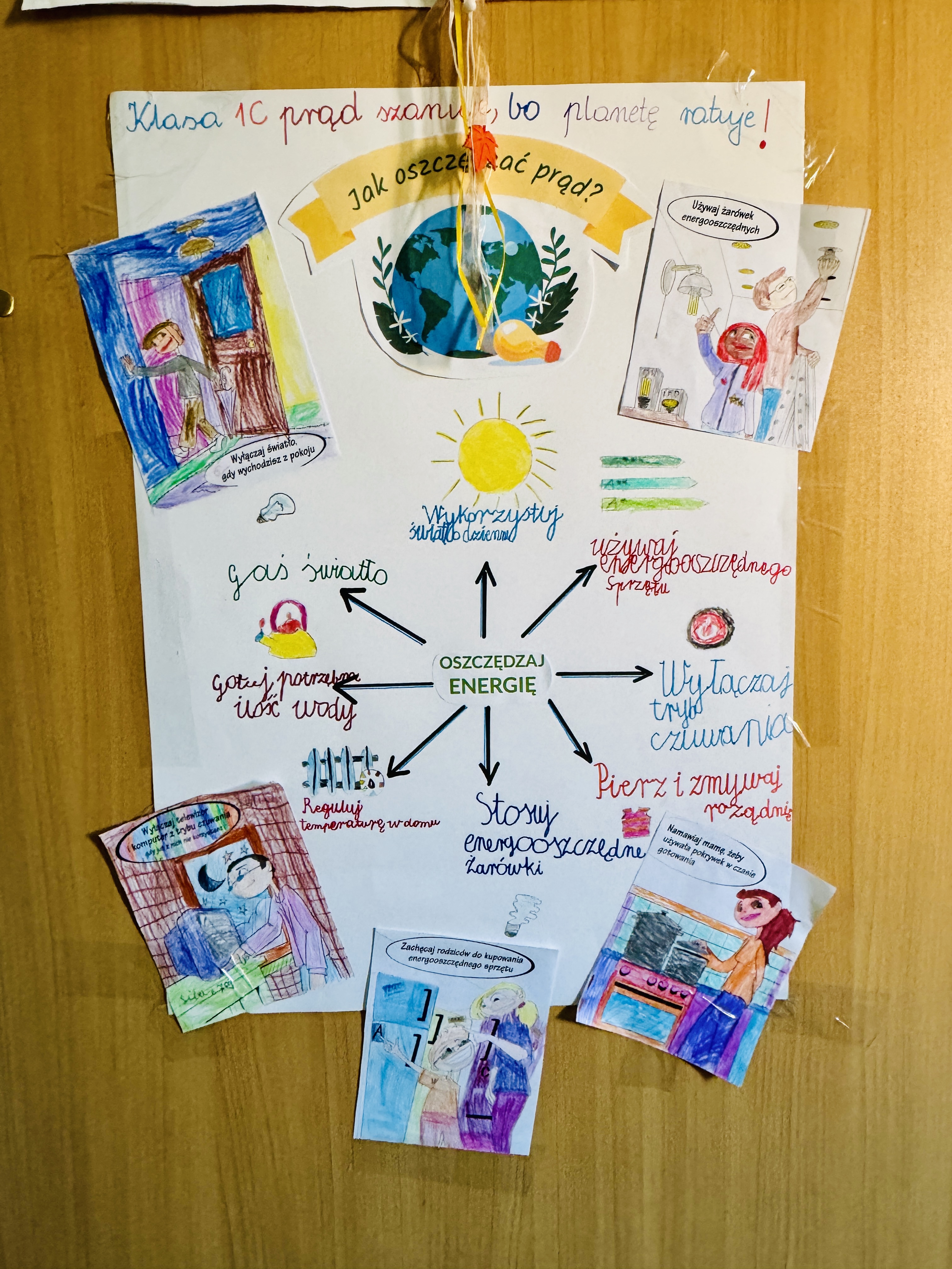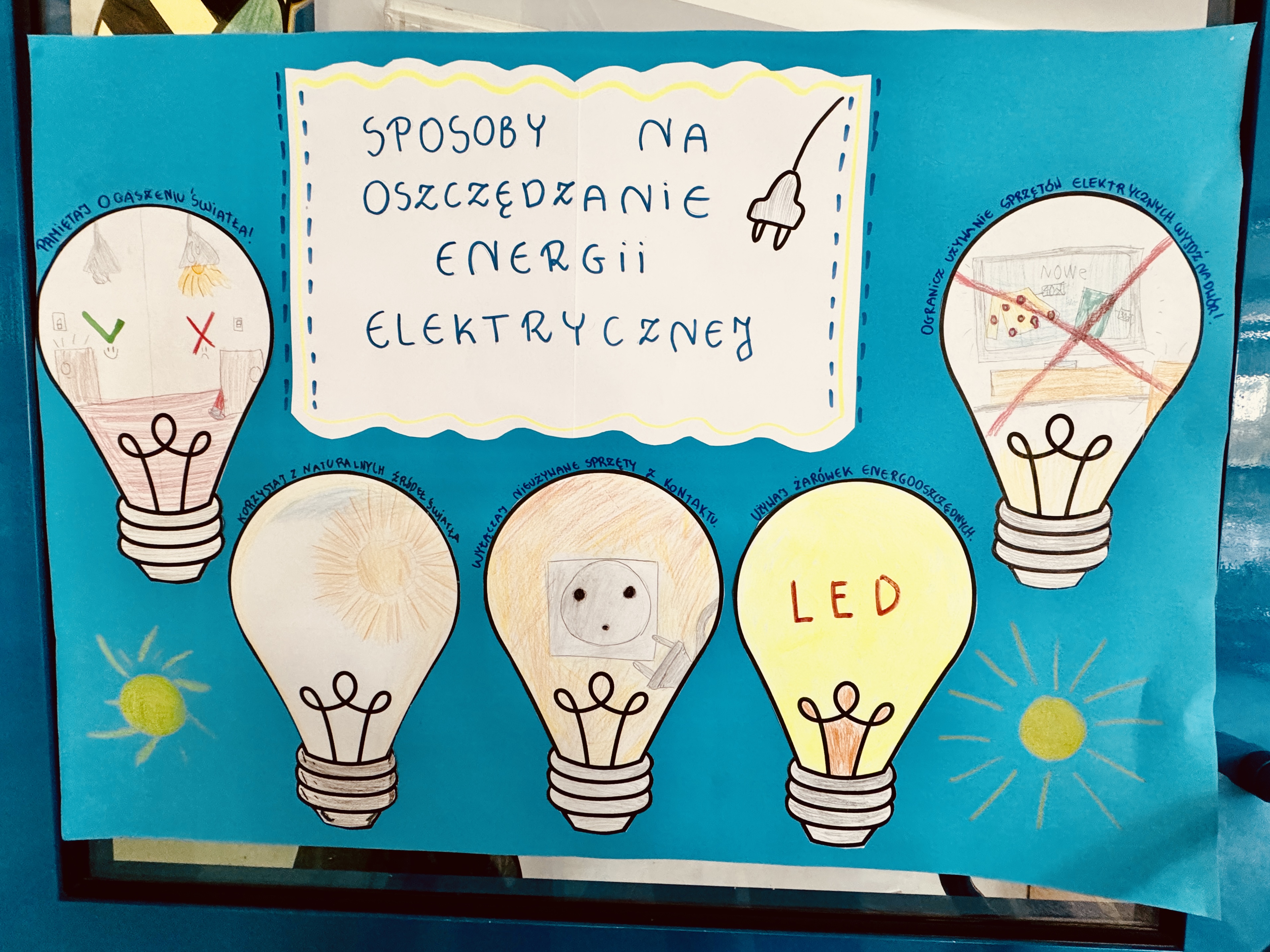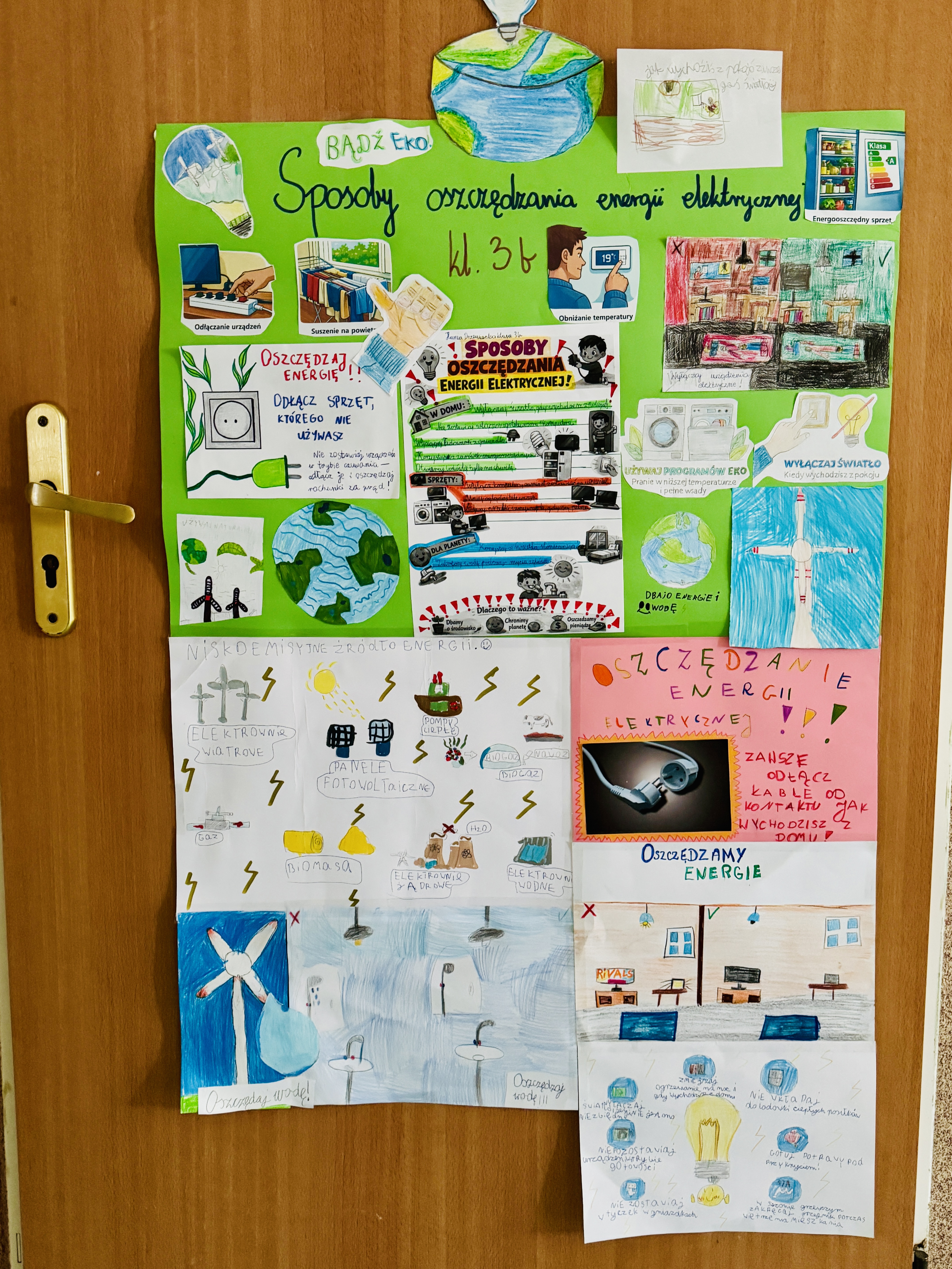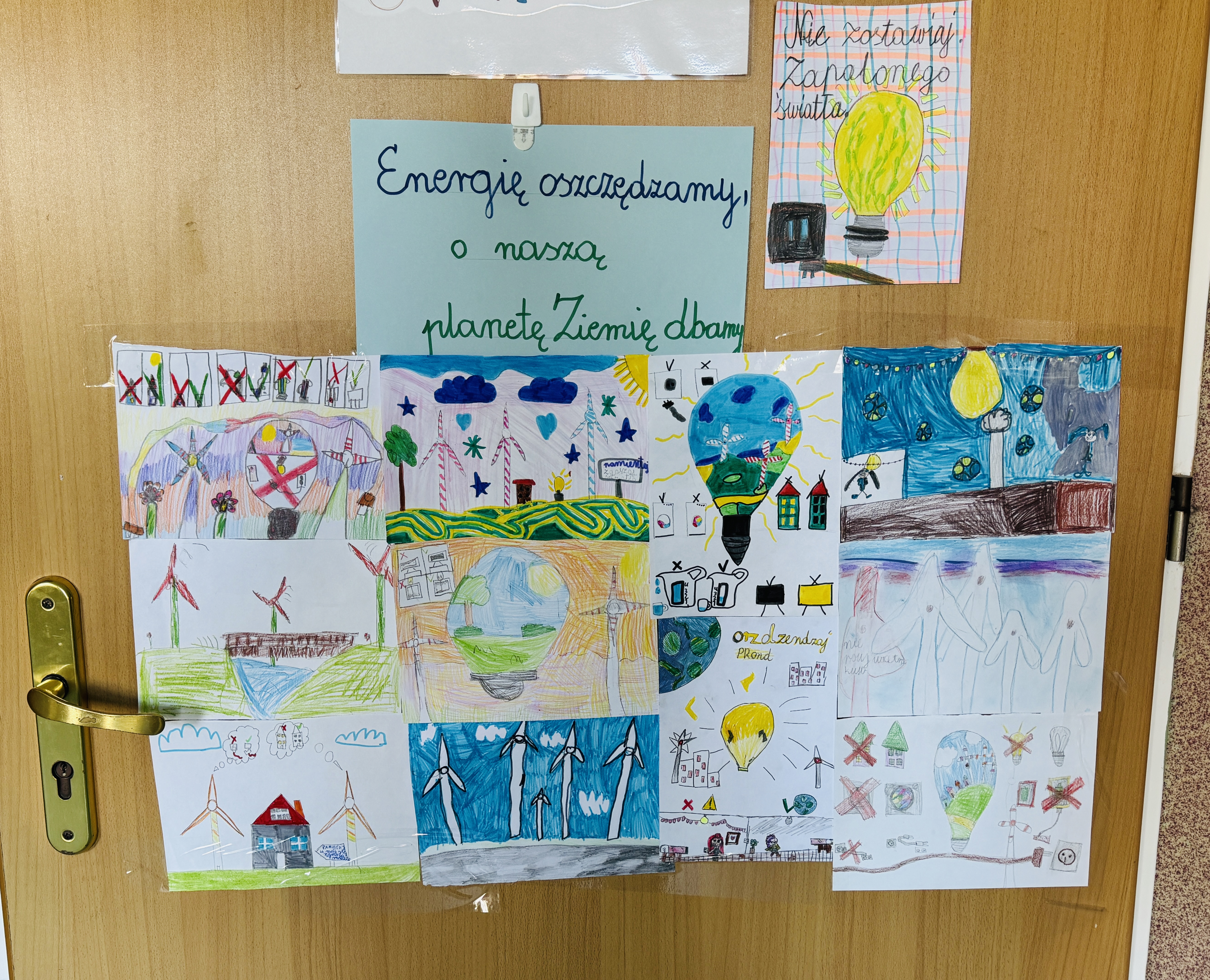 Uczniowie klas I – III wykonali szereg plakatów przedstawiających sposoby oszczędzania energii. Zostały one zaprezentowane na drzwiach klasopracowni.