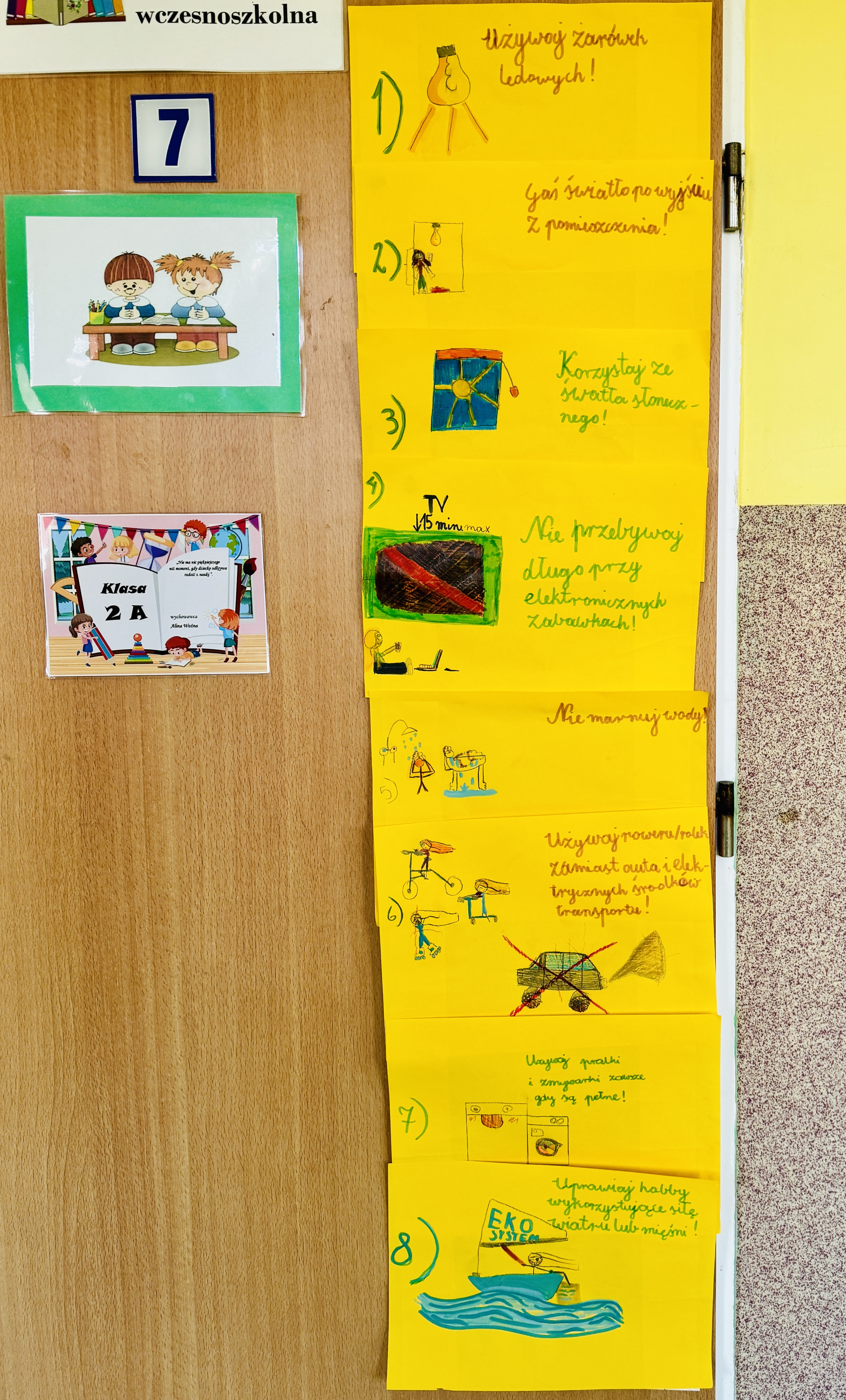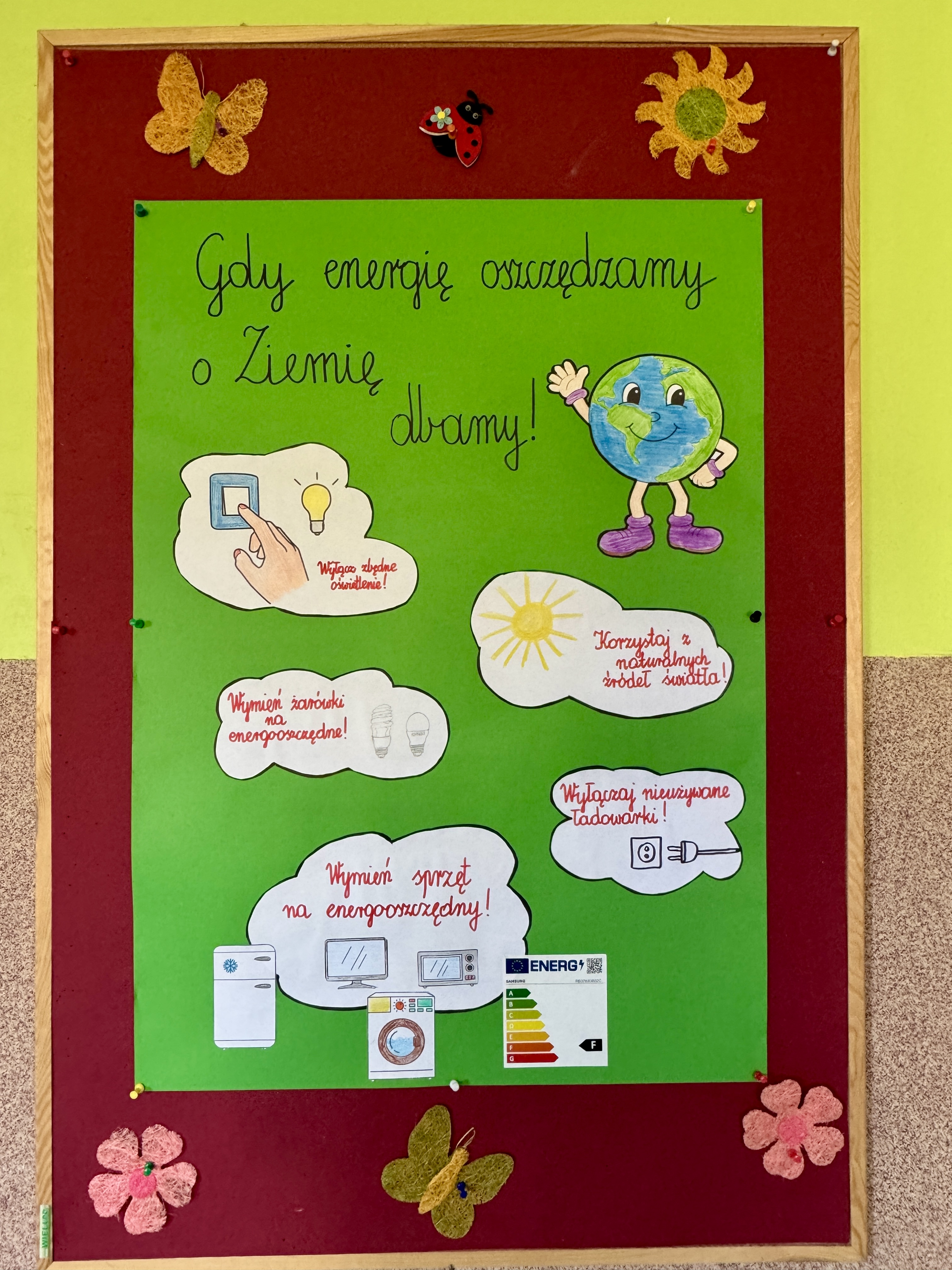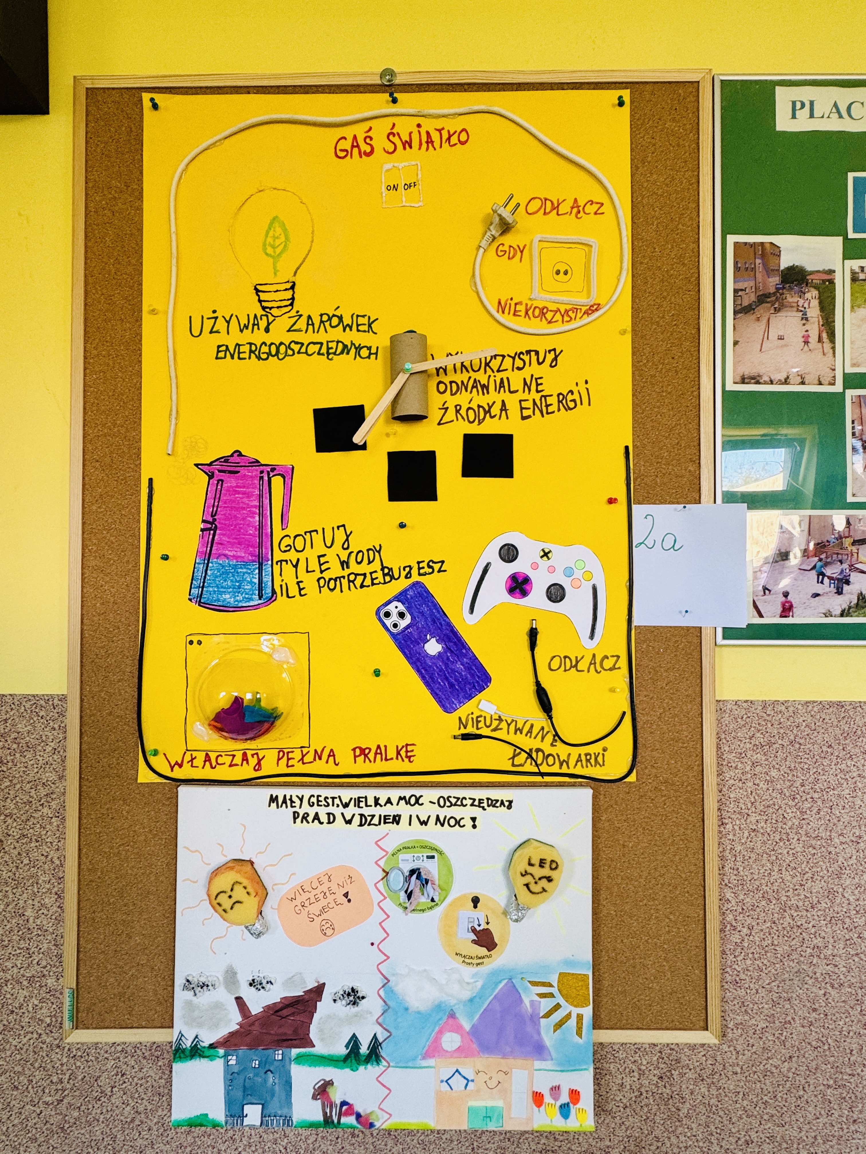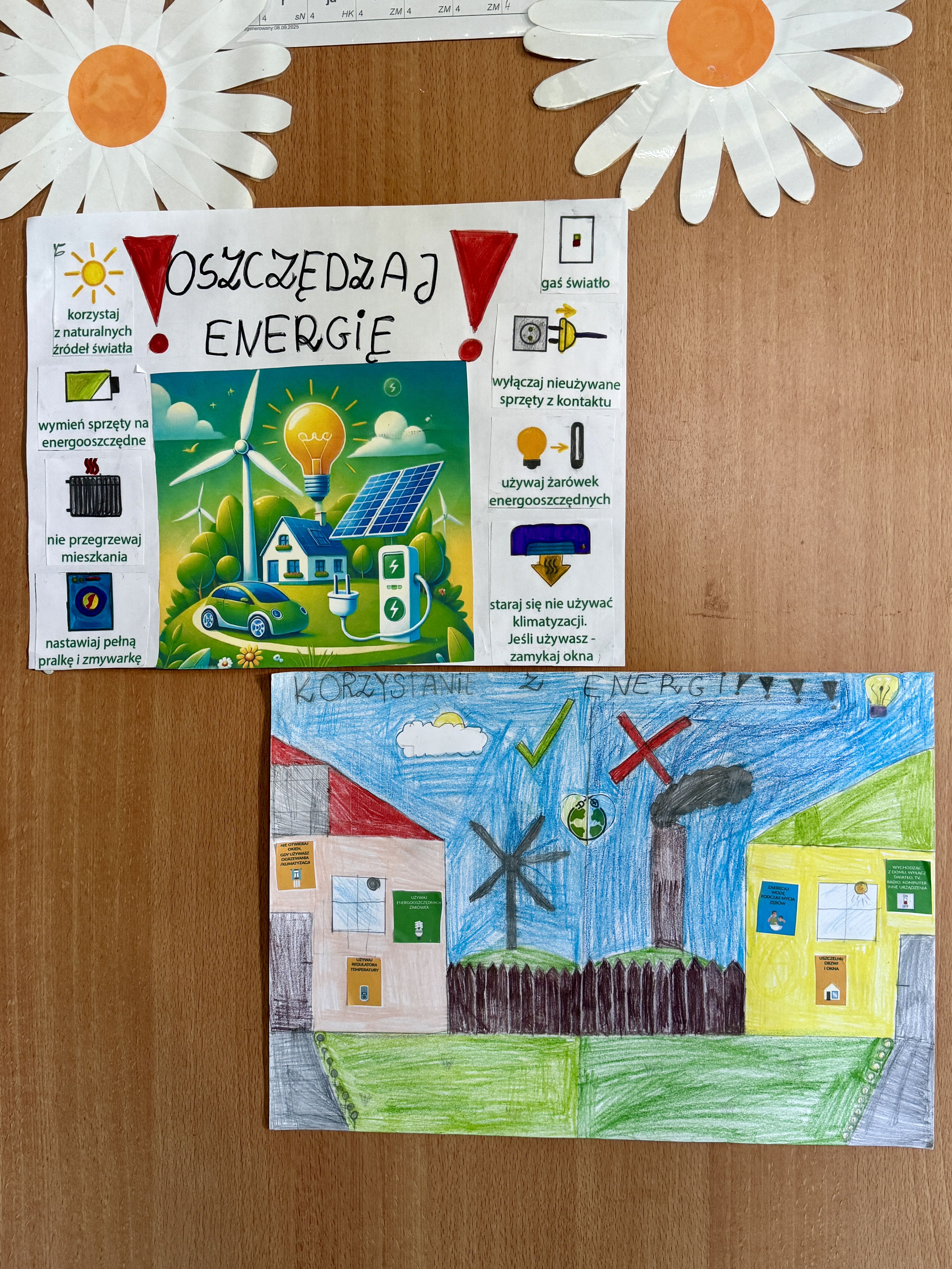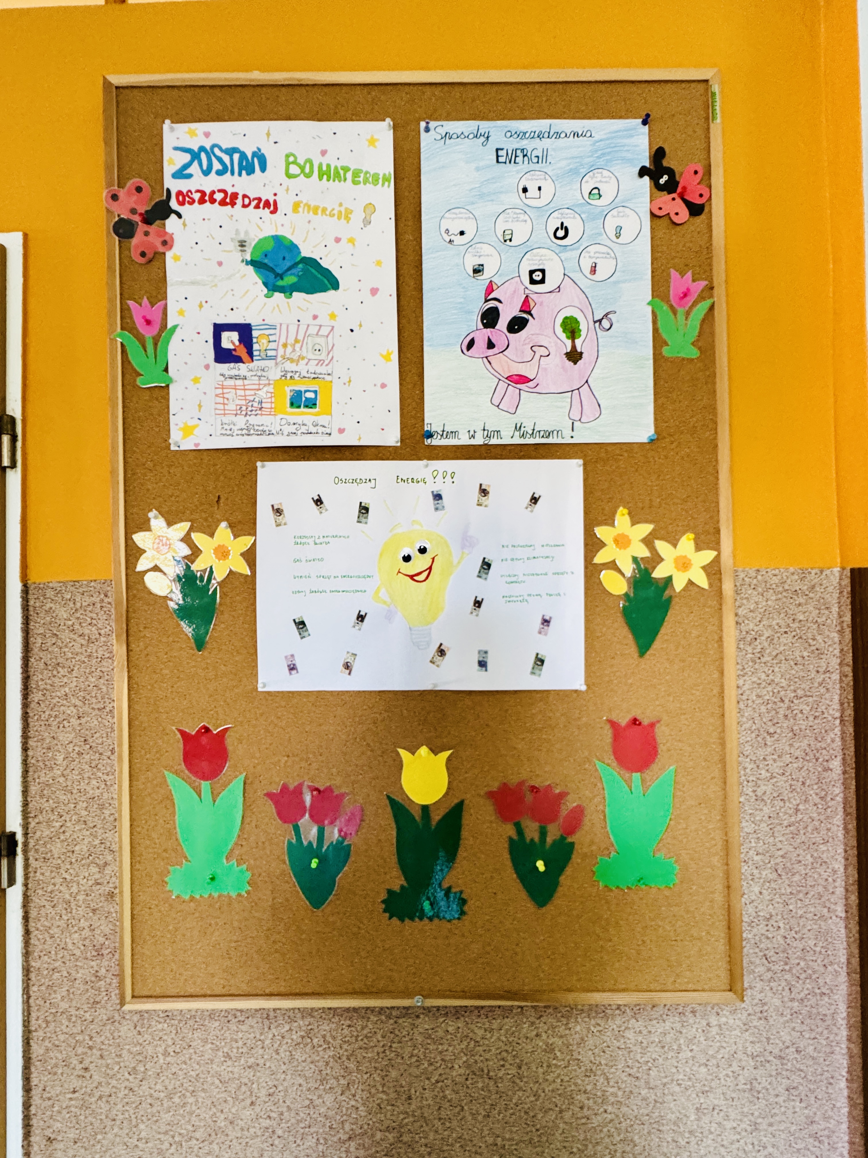 Uczniowie klas I – III wykonali szereg plakatów przedstawiających sposoby oszczędzania energii. Zostały one zaprezentowane na drzwiach klasopracowni.