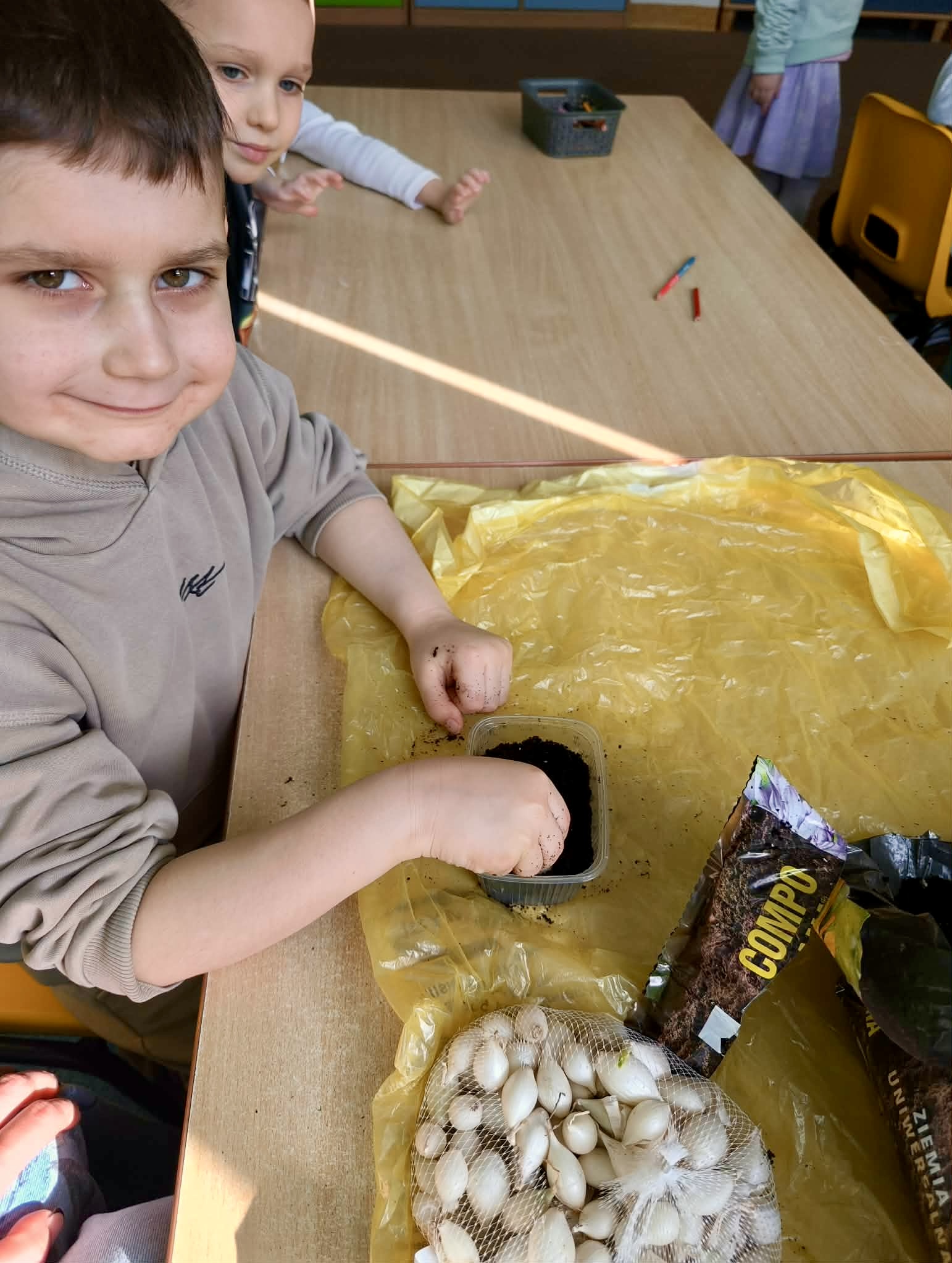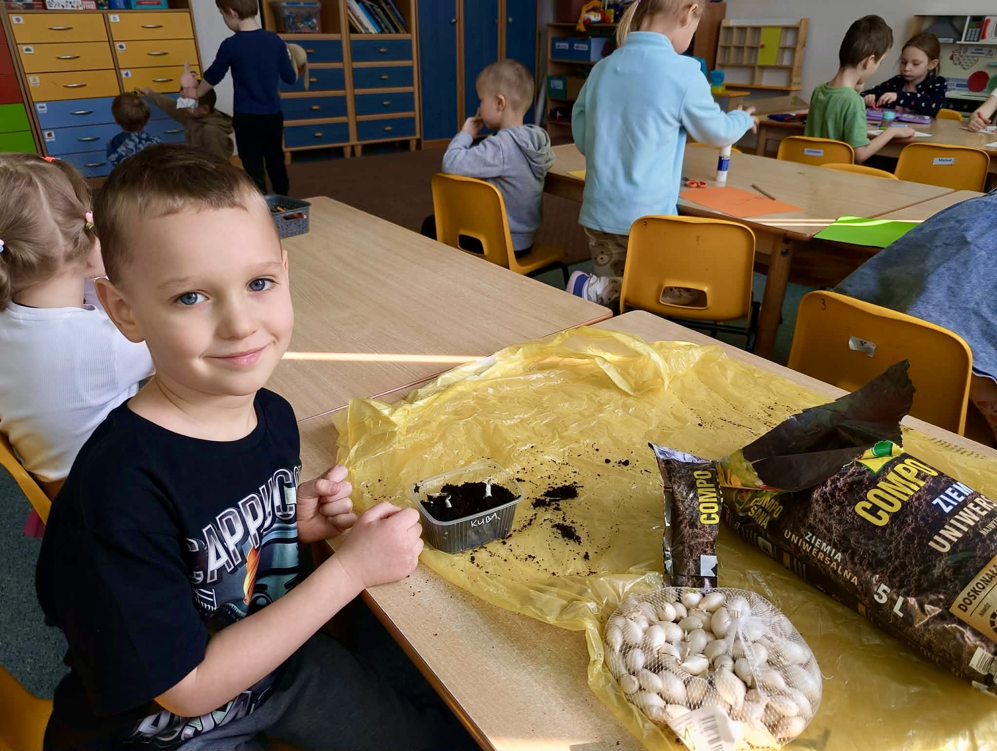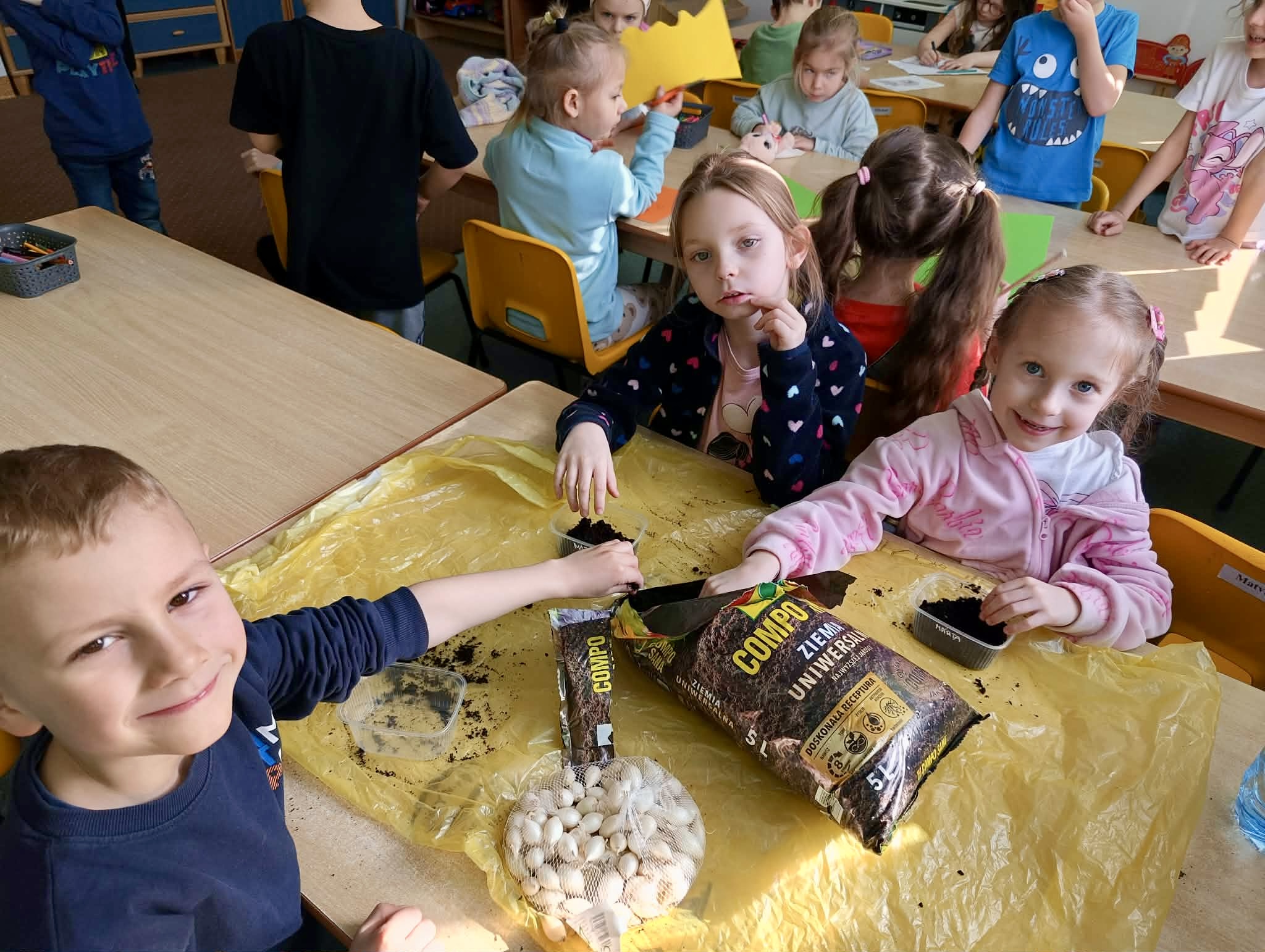 W ramach zajęć przyrodniczych dzieci z naszego przedszkola uczestniczyły w sadzeniu cebulek cebuli.